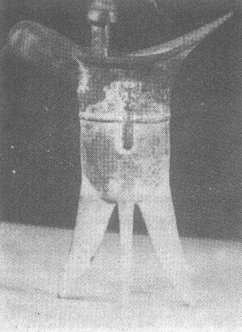 | 释义 | “天”铜爵西周。饮酒器。通高21.5厘米,口径8—14.5厘米,流长6.5厘米。湖北省襄樊市博物馆藏。此爵筒形深腹,三个三角形高尖足,流折处立双柱,腹饰一圈凸弦纹。两立柱外面各铸一“ ”(天)字,当为作器者族徽。“天”族族徽在商周金文中多见,此器“天”字和“天棘爵”铭文中“天”字相似,时代当在西周初期。“天”族青铜器多在中原地区,此爵系原襄阳地区文史馆收藏,不知出土地点。
