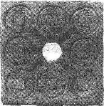 | 释义 | 四出五铢陶范南北朝梁武帝普通年间(约523—527年)。范为砖红色,近正方形,边长8.23、厚0.49厘米。8枚钱模分上中下3行排列,上下各3枚,中行2枚。正中浇铸口直径1.5厘米,口周围8个横铸道连通各钱模,其中4长4短,长者114,短者0.8厘米,排列紧凑。钱模直径2.4,外部0.15,穿边长0.7厘米,左右为阴文反写篆书“五铢”2字。背范钱模穿的四角有四出连外部。这种范可多层相叠进行浇铸,颇精巧合理。旅顺博物馆收藏。