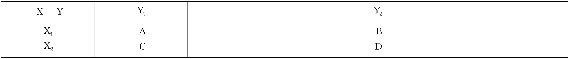 两个二值变量间的相关。设变量X取两个值X1、X2,Y也取两个值Y1、Y2,它们共有四种组合,在n次观察中取每一种组合的频数常列成如下的表格: