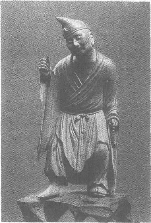 | 释义 | “子常”木雕济颠和尚清。高11.5厘米。浙江省温州市博物馆藏。济公头戴尖帽,衣着右衽宽袖大袍,弓身向前,裂着嘴,头略右倾,左手捻佛珠于腰侧,右手握扇(已失,只留有柄)于肩旁,赤右足,做欲行又止状,背面刻“子常”款章。此雕刻富于神韵,通过神态、举止的滑稽相,将济公佯作癫狂之态活脱脱地刻画出来。