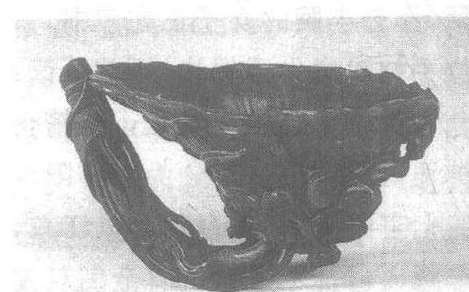 | 释义 | “尤侃”荷叶螳螂犀角杯明。高9.5厘米,口径14.9厘米。上海博物馆藏。体呈折枝荷叶状,有鋬,鋬作荷梗形直通杯底,中间镂空。杯外浮雕两朵荷花,中结莲篷,几个弯曲的枝条沿着荷梗辗转向上爬伏。杯中荷筋条条,在一荷梗筋上还停栖一螳螂。杯外侧近底部刻篆文款“尤侃”。此杯设计巧妙,制作精致,为犀角雕中难得的珍品。