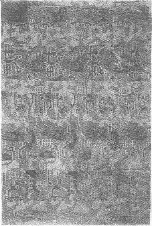 | 释义 | “延年益寿大宜子孙”锦东汉。残长37.5厘米,宽24.5厘米。1980年新疆维吾尔自治区罗布泊西岸楼兰故城东七公里高台墓地二号墓出土。新疆维吾尔自治区社会科学院考古研究所藏。此织锦褐色地,配以黄、蓝二色显花二重组织。锦面右边为一作奔走状的怪兽,兽嘴长伸,两耳竖立,身有圆圈斑纹。其正上方织有一“年”字,其脚前下织有一“益”字,兽头左边有一弯曲的变体云纹,其下方织有一“寿”字,中间的怪兽作急转弯回身动作,其上方织有一“大”字,前蹄下方织有一“宜”字,再往左的一怪兽作攀高峰的动态,紧挨兽尾部织有“子”字,皆为隶文。“延”和“孙”字已残缺,其文应为:“延年益寿大宜子孙”吉祥语。老庄神仙思想在汉代十分流行,在各种器物上所表现的云雾仙境,瑞兽,吉祥语,就是这种思想的反映。