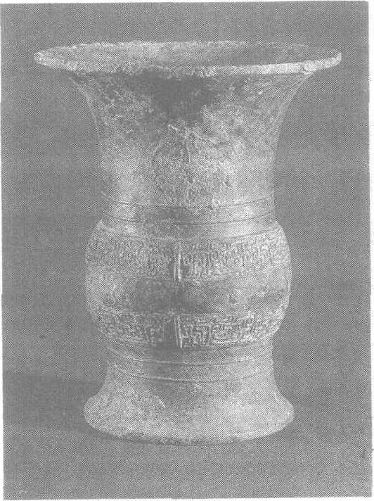 西周。古代盛酒器。高24.5厘米,口径19.5厘米。1974年北京房山琉璃河出土。北京首都博物馆藏。此尊侈口,膨腹,圈足外侈。腹部饰两道顾首夔纹带,上下各有两道弦纹。器内铸有铭文17字。内容记载燕侯赏器主以臣妾等项。