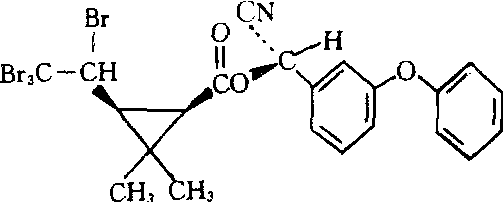 | 释义 | 四溴氰菊酯tralomethrin又称scout。化学名称:(S)α-氰基-3-苯氧基苄基(1R,3S)-2,2-二甲基-3-〔(RS)-1,2,2,2-四溴乙基〕环丙烷羧酸酯。化学结构式如下。技术级93%纯度是橘黄色树脂状固体,是两种异构体的混合物,密度0.901,沸点138~148℃。溶解度水中70mg/kg,在丙酮、二甲苯、二氯乙烷中1 kg/L。大鼠口服LD50(♂)为1 250、(♀)为1 070mg/kg,吸入LC50(♂)为2 700、(♀)为3 900 mg/m3,兔涂皮>2 000mg/kg。对鱼、蜜蜂剧毒。防治棉花、大豆、蔬菜的鳞翅目幼虫。