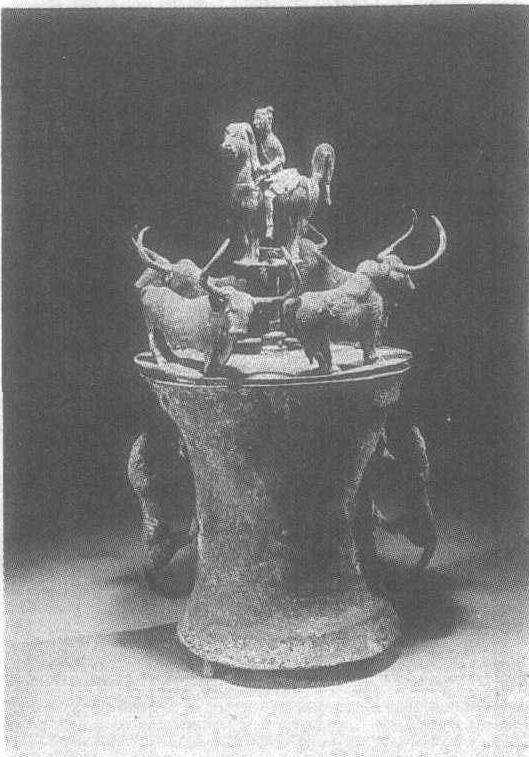 | 释义 | 四牛骑士铜贮贝器西汉。古代滇族统治者贮存贝币的用具。通高50厘米。云南省晋宁石寨山出土。云南省博物馆藏。器作束腰圆筒形,上部略大。腰间有对称虎耳,状极威猛。底有三足。盖上四牛,矮腿长身,卷角昂首,个个雄健如生;中央一长柱圆盘上,骏马伫立,骑士头绾高髻,身着戎装佩剑骑于马上,通体鎏金,威风凛凛。云南青铜器中,有不少表现战争场面的内容,诸如“骑士”、“献俘”、“杀人祭祀”的活动在器物上屡屡表现,出土兵器也甚多。这说明,地处边陲的云南,在奴隶制时代战争仍是掠夺财富和奴隶的重要手段。