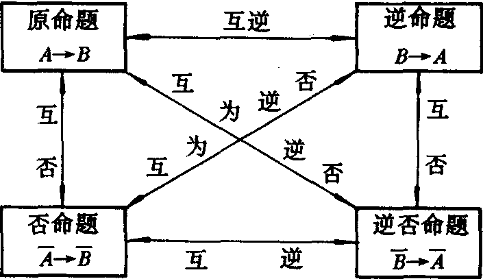 | 释义 | 四种命题的关系sizhong mingti de guanxi变化一个命题的条件与结论,可以得到一个命题的四种形式:“A→B”,“B→A”,“→”,“→”(参见“互逆命题”、“互否命题”、“互为逆否的命题”),其中,“A→B”与“B→A”,“→”与“→”是互逆关系,“A→B”与“→”,“B→ A”与“→”是互否关系,“A→B”与“→”,“B→A”与“→”是互为逆否的关系(见图).