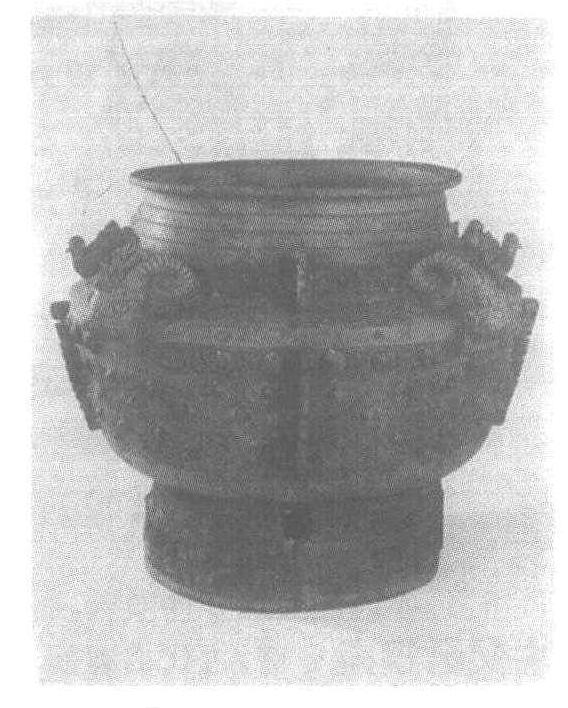 | 释义 | 四羊首铜罍商。古代盛器,用以储酒、水。通高38.8厘米,口径31.6厘米,腹径40.4厘米,底径29.1厘米,腹深28.9厘米。重14.24公斤。上海博物馆藏。此罍大口,翻唇,短颈,广肩,腹深厚。高圈足上有三个大方孔。肩上铸有羊首,貌极凶狞,中间以起棱的鸟形间隔,并以夔纹为地。腹上的乳钉雷纹是商代最古老的纹饰之一,其上沿还有一圈涡纹,这种独特的构图是殷墟中期出现的。乳钉雷纹在殷墟早期仅饰于方鼎、罍及簋上。密集的乳头似含有孽生繁殖或丰收之意。《说文》:“罍,酒尊。”《诗·卷耳》:“我姑酌彼金罍”,说明罍是酒器。《仪礼·少牢馈食礼》:“司空设罍水于洗东”,说明罍也可盛水。