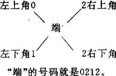 | 释义 | 四角号码查找法Sijiao haoma chazhaofa是一种流行较广的笔形代码查找法。这种方法是在1925年由王云五发明的,它把汉字所有的笔形分为10类,并分别用0123456789十个数字来表示,即由0代表亠,1代表一……等,然后根据汉字的方块特点,取4个角的笔形,用相应的数字连成代码,取笔顺序是左上→右上→左下→右下, 每字得四码。如: