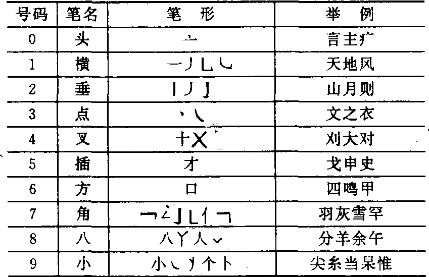 〔附〕四角号码歌: 横一垂二三点捺, 叉四插五方框六。 七角八八九是小, 点下有横变零头。 方法编排、检字的主要原因。 |