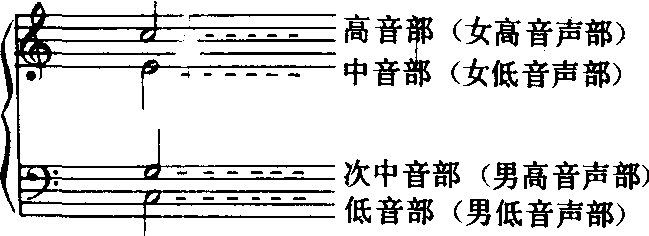 | 释义 | 四部和声由四个独立的声部组合而成的和声形式。它是音乐作品中最常用的声部组合方式,尤其在混声合唱中运用得更多。四部和声既能保证和声音响的丰满,又不会造成和弦音过多的重复而不能使声部间得到平衡,所以,它是和声写作的重要基础,也是和声习作中所采用的基本方式。四个声部由高而低依次称为高音部、中音部、次中音部、低音部。各个声部具有不同的作用:在一般情况下,高音部是旋律声部,低音部是和声的基础,这两个声部都属于外声部;中音部与次中音部起充实和丰富和声效果的作用,属于内声部,它们与高音部一起又总称为上方声部。各声部的音域大致与混声合唱中的女高音、女低音、男高音及男低音相同。四部和声一般应用大谱表形式写作,为了使声部划分得醒目,可将每一个行谱表中两个声部的符干分别向上或向下。如: