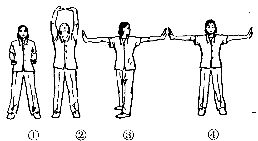 练功十八法第5套第1节。动作过程:两脚分立,略宽于肩,两手握拳收于腰间。(图2—4—144—❶)❶两拳变掌,翻掌上托,指尖相对,目视手背。(图2—4—144—❷)❷还原成预备抱拳。❸两手向前后推掌,同时上体左转90°,目视左手。(图2—4—144—❸)❹还原成预备抱拳。❺同❸动作一样,但方向相反。❻还原成预备抱拳。❼两手向体侧推掌,掌心向外。(图2—4—144—❹)❽还原成预备抱拳。共做4个8拍。注意事项:转体时两脚不要转动。此功对网球肘,腕、指腱鞘炎及肩、腰酸痛有一定的治疗效果。