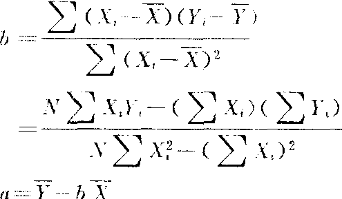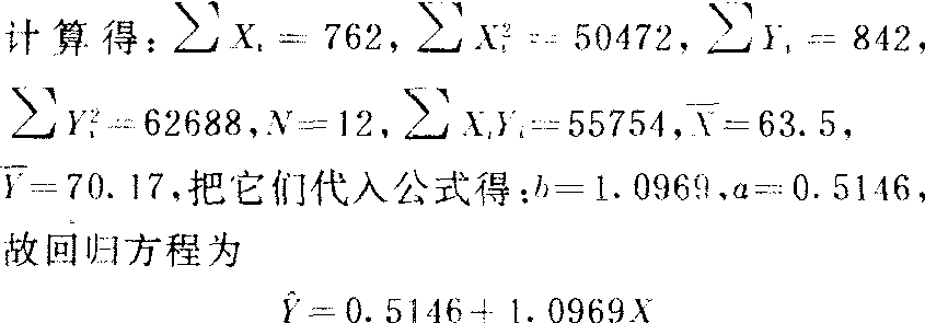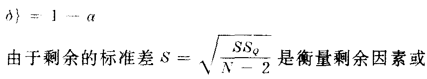 a=0.01及f1 =1和f2= 10查F分布表得F(1.10)0.01=10.0。由F>F(1,10)0.01=10,故拒绝假设H0,即回归方程的回归系数有极显著的意义,亦即回归方程的效果很好。 回归方程的效率是回归变差在总变差中所占的比重,即 式中 r——相关系数 其余符号同前。 从式中亦可知,回归效率恰为相关系数的平方。 69.5%。注意:如果F检验不显著,则有下列几种可能:❶影响Y的因素除X外,至少还有一个不可忽视的因素; ❷X和Y是非线性关系; ❸X与Y无关。 利用回归方程进行预测 从统计观点来看,所谓预测就是一个区间估计问题。即在回归方程中,在一定的置信水平α下,找出一个正数δ,使得某自变量X0所对应的实际观测值Ŷ0以(1-α)的概率落在(Ŷ0-δ,Ŷ+δ)之内,即 或![]() ![]() ![]() 称随机因素波动程度的指标。显然,S愈小即随机因素的波动愈小,则对Y0的预测就愈准确(即估计值Y0愈接近于Y0)。因此S是回归方程中预测Y0的精确度的指标。设X0来自于正态分布,则它所对应的Y0和Y0也服从于正态分布,因而Y0-Ŷ0也服从于正态分布。这就是说,当X=X0时,实际观测值Y0是以估计值Ŷ0为中心而正态地分布着,并且它与S之间有下述关系: Y0落在Ŷ0±S内的概率约为0.683(68.3%); Y0落在Ŷ0±2S内的概率约为0.954(95.4%); Y0落在Ŷ0±3S内的概率约为0.997(99.7%)。 就一般而言,Y0落在下面二直线之间的概率为1-a: ![]() 故Y0落在这2条直线内的概率为95%以上。 多元线性回归的方法与一元线性回归的思想基本相同,其回归方程为 ![]() 任何两个变量之离差积的平方和为 ![]() 则关于b1,b2,…,bk的正规方程组为 ![]() 解这一正规方程组可得:b1,b2,…,bk;