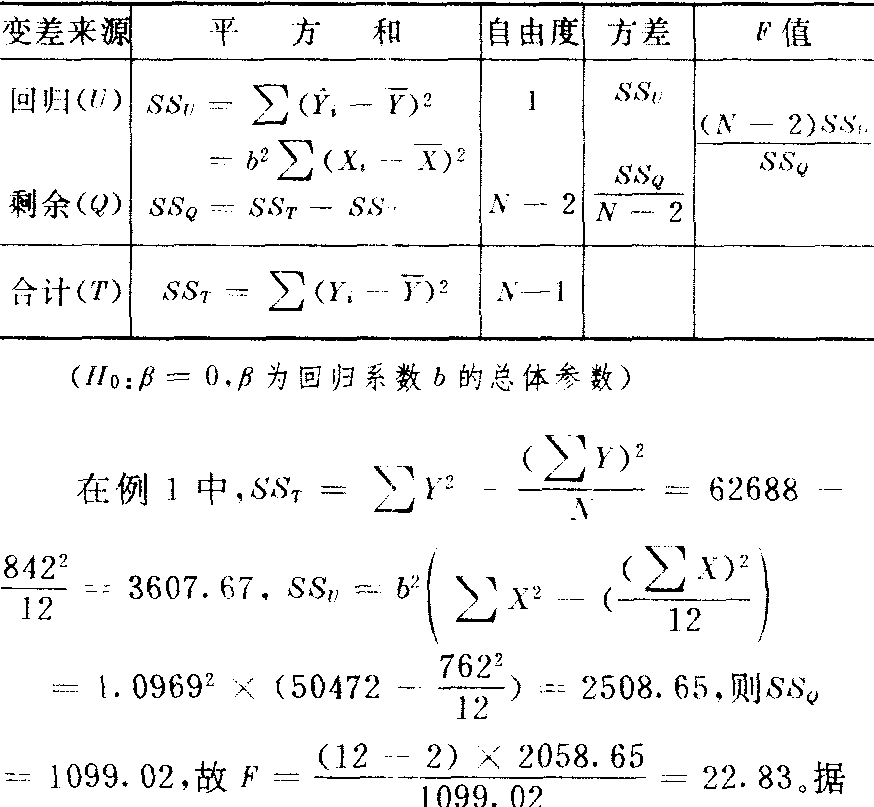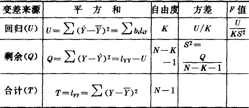 ![]() 回归方程的效果 这个问题具体指:❶回归系数b是否显著?若显著,则回归或预测效果较好。 ❷回归效率有多大?即能被预测的成分占总成分的比例有多少。为此必须先对回归方程进行统计检验。检验的方法是对回归方程进行方差分析,即把因变量(Y)之间的总变差(SST)分解成自变量(X)之间的变差(SSU)和剩余变差(SSQ): SST=SSL+SSQ 式中 SSU——回归平方和,属一种预测的变差 SSQ——剩余平方和,属一种非预测的变差 它们的方差分析表如下: