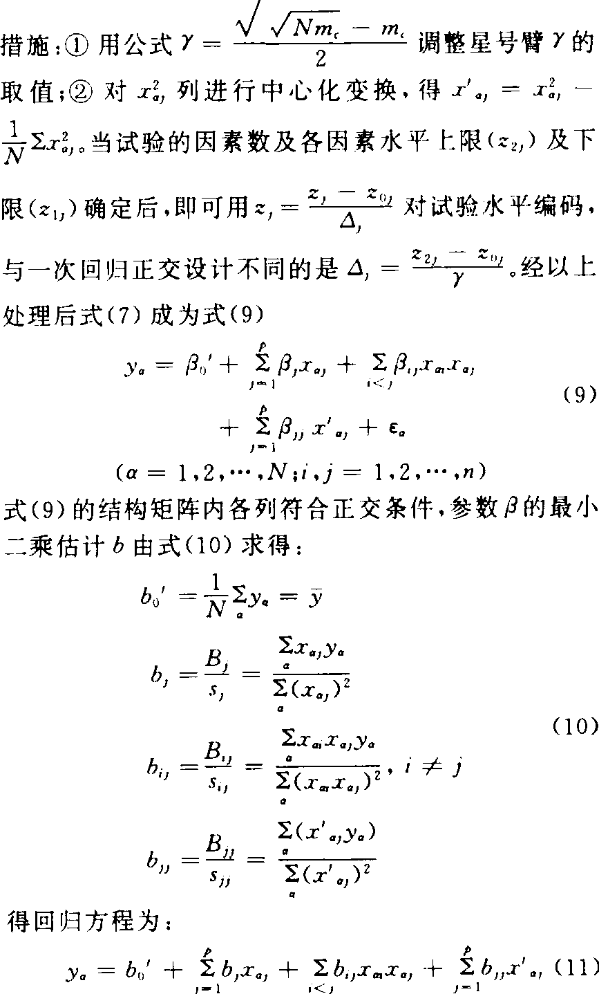 组合设计有5个水平(γ、1、0、-1、-γ),但处理组合数目比完全实施方案少得多,从而减少过多的剩余自由度。 为了使式(7)结构矩阵符合正交条件采取了二个