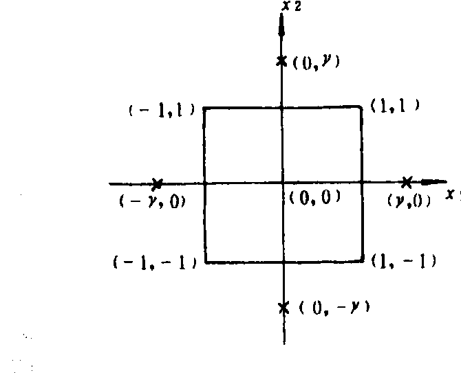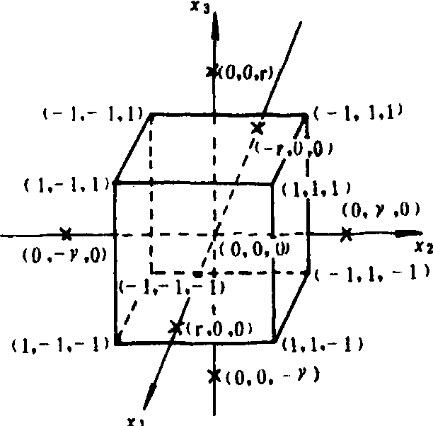 各个因素的水平数必须多于3个才可求出式(7)中的二次项。为了精确绘出二次曲线,常须进行5个水平的试验,这时处理组合数将多到无法实施,解决这个困难的方法是组合设计。组合设计各实验单元的处理内容由三部分组成:❶mo。为二水平正交表中各处理组合。 ❷2p。为分布于p个因素坐标轴上距中心点距离为γ的轴点,称为星号臂。 ❸m0。各因素都取零水平的中心点。 二因素及三因素试验各处理组合在因子空间中的分布如图1、2。