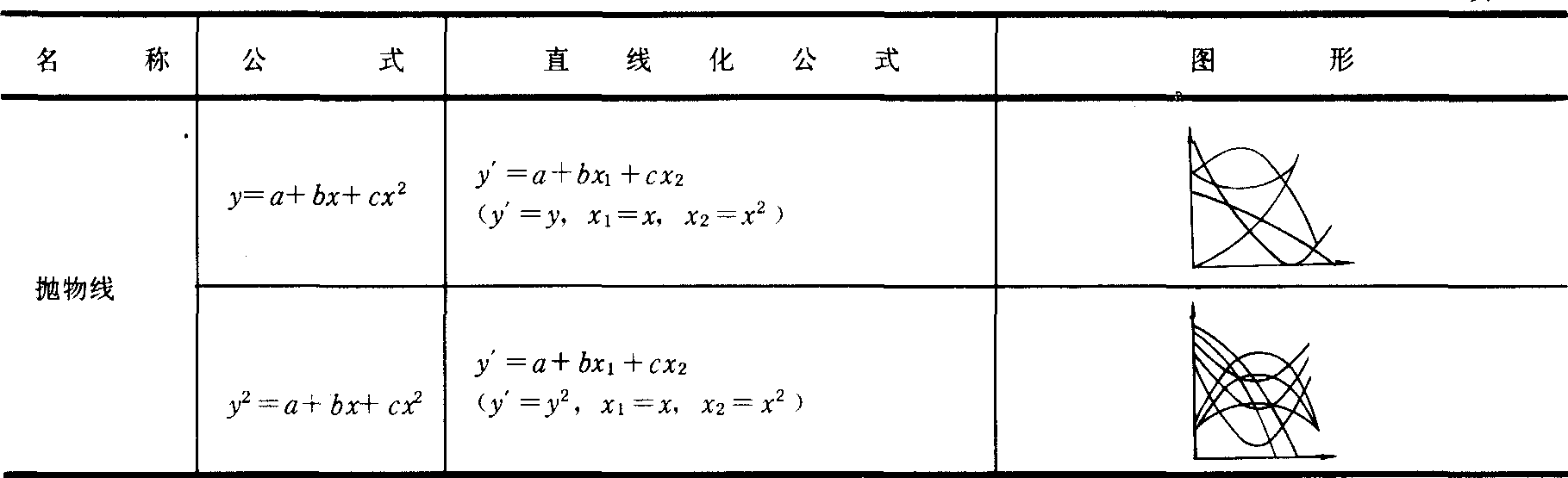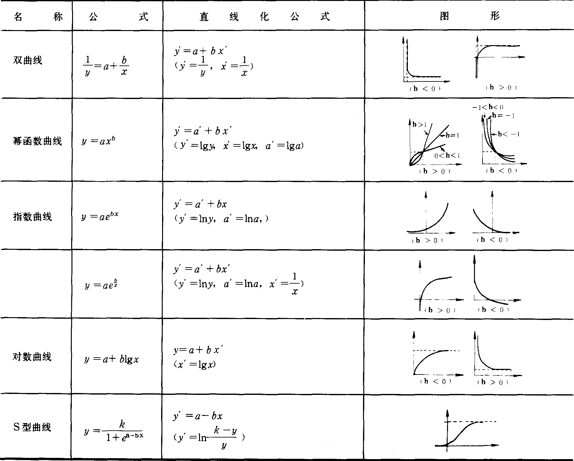 检验预报符合率 (报准次数与预报总次数之比),即检验所建回归方程的符合程度,一般有两种方法:❶回测符合率,即用历史资料代入预测式,统计其符合程度; ❷预测符合率,即用实际发生的资料代入预测式,统计报准百分率。 曲线回归方程 预报因子(x)与预报量(y)成曲线关系时,应建曲线回归方程。建立方法有直接和间接两种: 间接法 曲线先化直线,再建立预测式,即首先确定上述曲线可能属于何种常见曲线,再按该常见曲线直线化方法,求出回归方程。常见曲线有双曲线、幂函数曲线、指数曲线、对数曲线、S形曲线、抛物线六种(见表)。 常见曲线表