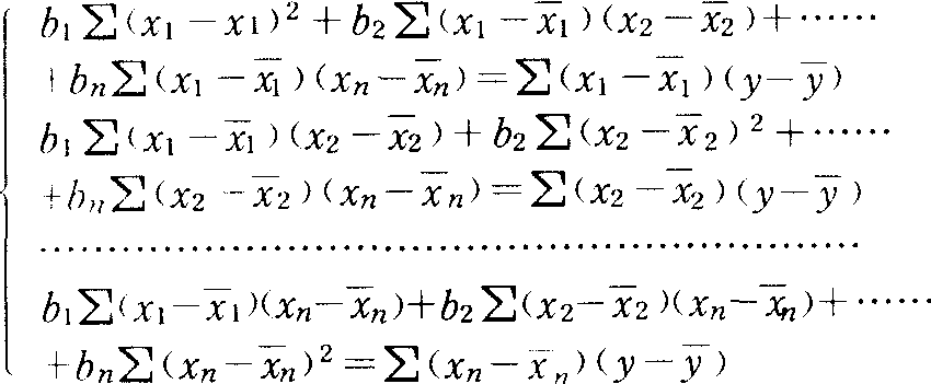 式中 y为估计值,y为实际值,查x2表(自由度n—3),凡所求的x2值大于或等于表中P=0.05的x2值,则所配曲线方程不适合,反之为适合。 多元线性回归方程 当需要采用多个预报因子建立预测式时,可用复相关分析、偏相关分析、逐步回归等法。用复相关法时,可先对预报因子作复相关检验,后建复回归方程,再对此方程用x2表进行适合性检验,和用F检验表作显著性检验。但在实际工作中,因复相关系数难求,常可先建多元回归方程,再对方程进行复相关系数检验或F检验。多元回归方程通式为: y=b0+b1x1+b2x2+……+bnxn 式中 b1,b2,……,bn为回归系数,其求法可根据最小二乘法列出方程组: