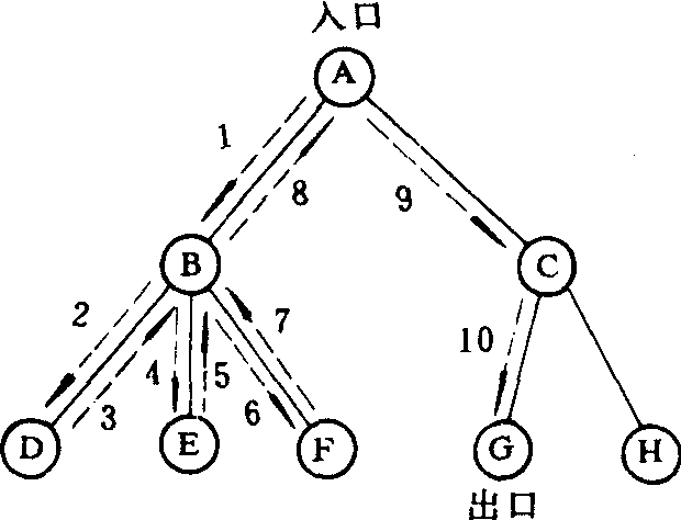 本例的试探搜索的步骤用虚线加箭头标在图上.结点B,D,E,F构成以A为根的树的一个枝杈,开始先走这个枝杈(从第1,2,…,到第7步),走不通了,由第8步返回A,再走另一枝杈(由C,G,H组成),经第9,10步就可觅到出口.许多问题的求解过程都会用到这种回溯探索的控制策略. |
