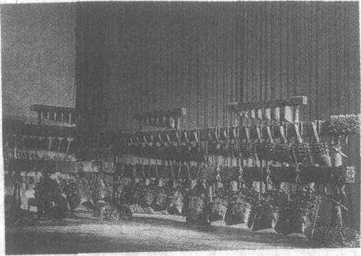 | 释义 | “曾侯乙”铜编钟战国·曾。打击乐器。1978年夏湖北随州市擂鼓墩曾侯乙墓出土。湖北省博物馆藏。钮钟19件,甬钟45件,另有楚惠王熊章送给曾侯乙的镈钟1件,计65件。钮钟最小的一件通高20.4厘米,重2.45公斤;最大的一件通高39.9厘米,重11.4公斤。其上均有标明音律、音阶的铭文,如“商”、“𦏴曾”等,且多错金。甬钟最小的一件通高37.3厘米,重8.3公斤;最大的一件通高153.4厘米,重203.6公斤。钟上皆有错金铭文,钲部为“曾侯乙乍𦏴(持)”六字,余为标音与乐律铭文,诸如: “𦏴曾”、“宫曾”、“峉角”、“𦏴角”、“峉曾”、“峉反”、“宫反”、“商”、“宫角”、“峉”、“𦏴”、 “宫”、 “商”、“下角”、“少𦏴”、“少商”、“角反”、“𦏴反”、“商曾”等。镈钟通高92.5厘米,钮高26厘米,重134.8公斤。钲部有铭文三行31字:“隹(唯)王五十又六祀,返自西(阻),楚王酓章乍(作)曾侯乙宗彝,之于西,其永𠱾(持)用享。”内容与音乐无关,是惠王酓(熊)章得知曾侯乙死后赶铸送给曾国的,它挂置在钟架下层最显要的位置。编钟总重量为2500公斤。编钟架为曲尺形,上、中、下三层,铜、木结构,通长7.48米,宽3.35米,高2.73米(曲尺另一面长3.35米)。七根横梁(笋)上髹黑漆彩绘纹饰和刻文,两端为浮雕、透雕的龙、鸟、花瓣等纹饰的青铜套。架的中、下两层各有三个造型端庄,神态安详,束腰、佩剑的钟铜人。这六个铜人,以手或头通过榫卯结合承托横梁,十分稳固。下层的铜人连座,通高1.17米,重321公斤。全套钟架,可自由装卸,共由245个构件组成,结构非常合理,连悬钟的挂钩的设计也不草率,如下层的爬虎形状的挂钩,就由7个部件合成,扣紧钟架,既实用又显得雄壮美观。钟架近旁还有六个丁字形彩绘木槌和两根彩绘木棒,以供敲、撞编钟之用。如此完美的铜编钟的出土,无疑是我国考古史上的若干重大发现之一。其精美的青铜铸造水平,令人观为叹止。诸多的铭文,对研究战国时曾国的历史,曾、楚的关系,特别是对民族音乐史的研究,具有特别重大的意义。专家据钟上标音铭文和实际测音,每件铜钟均能发出两个乐音,同套编钟上有可供旋宫转调的12个半音。全套编钟音域宽广,五个八度,12半音齐备,高音明亮,中音悠扬,低音浑厚深沉,至今仍可演奏出古今中外较为复杂的和声、复调、转调的乐曲,所有这些,在不同程度上对于解决我国民族乐律上的若干问题,具有重大意义。同时出土的乐器,还有笙、排箫、琴、瑟、笛、鼓、编磬等八种包括编钟在内共计124件。其中排箫、建鼓、和五弦乐器为首次发现。笛,则是迄今所见我国最早的横吹竹笛。曾侯乙墓出土的大量精美的文物,除乐器外,还有青铜礼器,玉器,金器,漆木,竹器,兵器,车马器,竹简等,件件都凝聚了我国古代人民的智慧结晶,对研究春秋、战国时期的历史、科学和文化提供了珍贵而翔实的资料,具有重大的科学和历史价值。