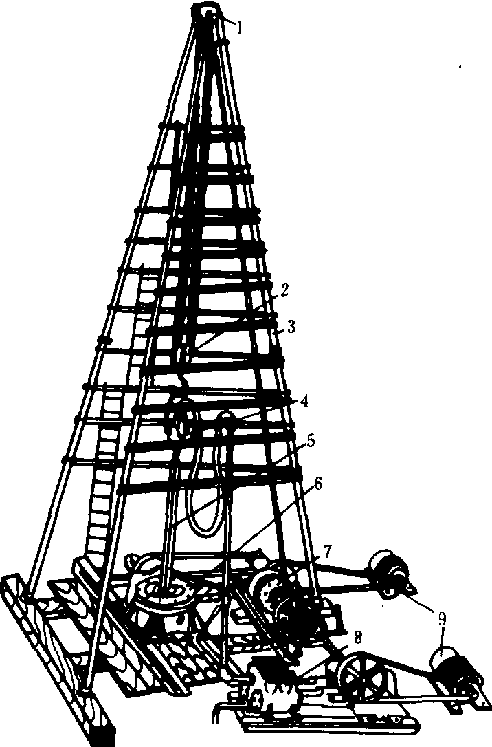 回转式钻机 1.天车;2.游动滑车;3.塔架;4.水龙头;5.钻杆;6.转盘;7.卷扬机;8.泥浆泵;9.电动机 全液压动力头式水井钻机是20世纪70年代发展起来的一种特殊类型的转盘回转式钻机。它是把转盘和水龙头二者合为一体,即动力头。液压马达通过动力头减速后直接驱动钻杆旋转,并用油缸、钢绳(或链条)来提升钻具。同时动力头作为加压或减压装置使用,可精确地控制钻进速度和给进压力,并可取代卷扬机、天车、游动滑车等一系列笨重复杂的机构。这种钻机变速范围大,钻进效率高,过载敏感性好,是有发展前途的一种回转式钻机。 回转式钻机rotary drilling rig工作部件连续转动进行打井的机械。由塔架、转盘、转杆、钻头、泥浆泵、绞车、动力机等组成。工作时,动力机通过传动装置驱动转盘,由转盘通过钻杆带动钻头旋转破碎地层。泥浆泵通过管路将泥浆压入空心钻杆,向下流入钻头,再从钻头的出水口射出,以冷却、润滑钻头并将井底岩屑带出井口,通过沉淀池沉淀,泥浆仍流回泥浆池循环使用。有全面钻井和环状钻井两种。前者是用钻头破碎井孔截面内的全部岩层,适用于松散岩层的钻进;后者只破碎井孔内的 一个环状岩层,中间留下 一圆柱状岩心,钻出一定长度后,需专用工具截断,再从井孔内完整地取出,适用于完整基岩的钻进。 |