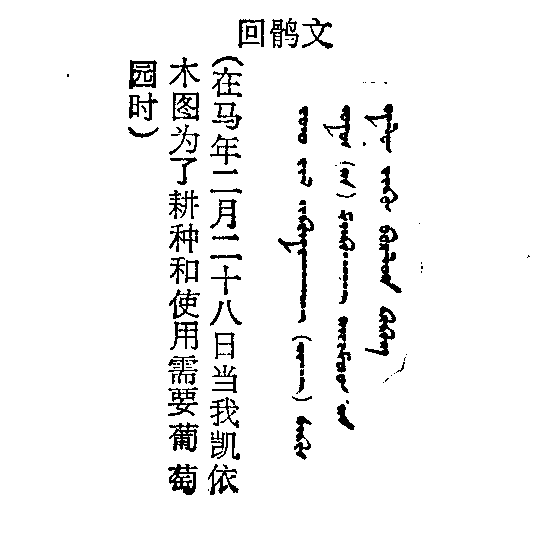 | 释义 | 回鹘文亦称回纥文、畏兀字。8至15世纪回鹘人使用的文字。源自后期粟特文,属音素文字类型。是古代维吾尔人在采用阿拉伯字母文字以前使用最广、目前保存下来文献较多的一种文字。漠北时期的回鹘人已开始使用回鹘文,回鹘西迁后遂广泛通行于今吐鲁番盆地以西至中亚楚河流域的广大地区。曾作为喀喇汗朝、元朝和金帐汗国的官方文字使用。回鹘文大约由19至23个符号组成,依时代先后字母数目有所不同。在早期文献中,一个字母有时表示两个以上的语音,后期文献才在相应的字母左、右方加一点或两点区分开。字母因在字中出现的位置(字头、字中、字尾)不同而有不同的形式。早期回鹘文从右向左横写,后在汉文影响下改为从左到右竖写。字体分为刻本体、写经体和草体三种。常用的标点符号是两点或一点。表示段落用四点( 回鹘文回鹘人仿效粟特字母而创制和应用的拼音文字。共有19—23个字母,其中5个为元音,2个为半元音,其余都是辅音。每个字母有字头、字中、字尾三种不同的书写形式。早先自右向左横写,后来改为竖写右行,书写规格有草书和楷书两种,草书用于书写一般文书,楷书用于书写和印刷经典。唐朝后期至清朝初期(9世纪—17世纪前叶)流行于甘州回鹘、西州回鹘、龟兹回鹘、喀喇汗王朝西回鹘、撒里畏兀儿人中,因此,在中亚的哈萨克斯坦、吉尔吉斯斯坦、乌兹别克斯坦、在我国新疆、甘肃、内蒙古西部曾经发现大量由回鹘文书写、刻制、印刷的佛教、摩尼教经典、文书、契约、题词、碑刻。 回鹘文回鹘人仿效粟特字母创制和应用的拼音文字。共18—23个字母,5个为元音,2个为半元音,其余为辅音。每个字母有字头、字中、字尾三种不同的书写形式。唐朝后期至清初流行于甘州回鹘、西州回鹘、龟兹回鹘、喀喇汗王朝境内。 回鹘文亦称“回纥文”。八至十五世纪回鹘(即维吾尔)人使用的文字。属音素文字类型。主要通行于今吐鲁番盆地、及中亚楚河流域。以粟特字母为基础创制而成,字母数因年代差异而有所不同。文献中使用较少的为十八个, 最多达二十三个。其中二十二个辅音由十八个字母表示,八个元音由五个字母表示。在早期文献中, 一个字母有时表示两个以上的语音, 后期文献才在相应的字母左右加一个或两个点加以区别。字母分字头、字中、字尾。句读符号用一个或两个点表示, 段落用对称方形的四个点“
