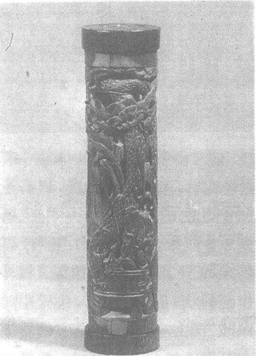 | 释义 | “朱缨”竹刻刘晨、阮肇人天台香薰明。高16.5厘米,径3.7厘米。1966年出土于上海宝山县顾村镇朱守城夫妇墓。上海博物馆藏。香薰两端有紫檀木制的盖和底,均刻蟠螭纹。薰体刻刘晨、阮肇在天台山与仙女对弈的故事:在盘曲虬转的松树下,一对男女对坐下棋,旁边一男子观望助兴,目光均凝神注视女子右手正欲点落的棋子。松干后,半开的洞门匾上阴刻“天台”二篆字,及阴文“朱缨”“小松”方印。据传东汉明帝永平五年(公元62年),剡县刘晨、阮肇共入天台山,后迷路,偶遇二仙女,被邀至家中热情款待。半年后二人思乡求归,被指路回乡后,方知世上已过了数百年。此香薰所刻即刘、阮入天台山与仙女生活的情景。其层次分明,中心突出,人物神态生动传神,为竹刻中极精之作,是朱缨的代表作品。朱缨,号小松,字清甫,明代刻竹名家,为嘉定派刻竹的代表人物。