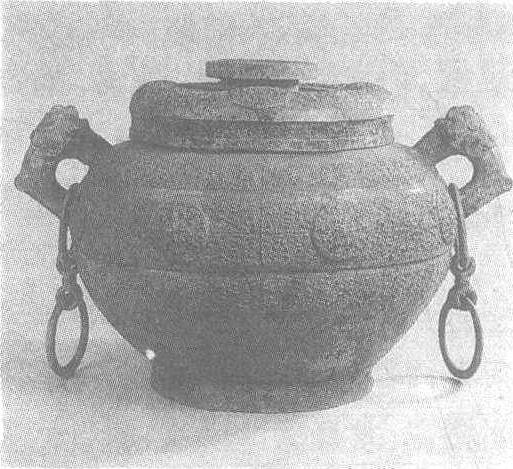 | 释义 | “楚高”铜罍战国。古代盛酒、水器。通高37厘米,口径24.5厘米。1954年山东省泰安县东更道村采集。北京中国历史博物馆藏。此罍有盖,兽首双耳衔环,底内凹成矮圈足。盖冠有一圆形钮,盖面四周突起六个涡纹圆饼,腹中部凸起一道环带,其上亦凸起八个涡纹圆饼。器身自下腹以上,遍饰细密蟠螭纹。口沿唇部铸有铭文“右冶尹楚高”五字。此器造型庄重,纹饰繁细,当为战国时期遗物。