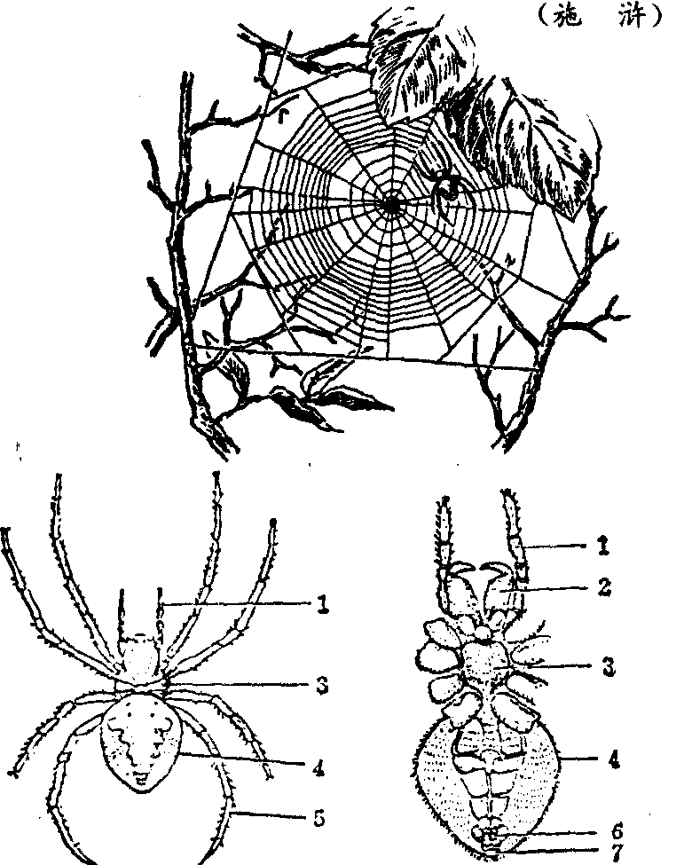 园蛛garden spider;Aranea又称圆网蛛。蛛形纲,圆网蛛科。体型大,黑褐色。雄体较小;雌体大,长可达3 cm。体分头胸部和腹部,中间有细腰相连。头胸部有附肢6对,第一对为螯肢,第二对为脚须,在雄性其末端膨大形成交接器,其余4对为步足,足上多刚毛。傍晚时,常在墙角、屋檐、树杈间张网,捕食昆虫。网大,呈车轮状。如十字园蛛 (A.dia-dematus)、大腹园蛛(A.ventricosa)、肥胖园蛛(A.pinguis) 。 |
