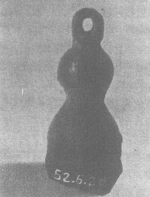 北朝·北齐。通高5.3厘米,底径2厘米。实重74克。北京中国历史博物馆藏。此秤砣用铁铸成,通体略有磨损,上为圆形环鼻钮,下为葫芦形,平底,腹部有阴文“武平”、“元年”。“武平”是北齐范阳王年号,武平元年为公元557年。