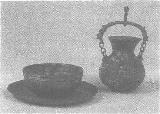 | 释义 | “永兴元年”鱼鸟纹铜洗东汉。高22.3厘米,口径47厘米。辽宁省博物馆藏。洗系盥洗用的青铜器皿,类似后世的脸盆。此铜洗,盘口方唇,圆腹,腹微鼓,平底。腹壁饰弦纹带,间以双兽首。内底正中铸有“永兴元年堂狼造”阳文七字款。两侧饰鱼鸟纹,鱼吐泡上浮,安然自若的鸟则隔行伫立,注视之,十分生动。铜洗盛行于东汉时期,但有纪年的较少。此洗铸于汉桓帝永兴元年,即公元153年。汉堂狼县在今云南省。鎏金铜盏、盘、壶 十六国。盏高3.75厘米,口径9厘米;盘高1厘米,口径13.3厘米;壶通高12厘米,口径5.3厘米。1965年辽宁省北票县西官营子冯素弗墓出土。辽宁省博物馆藏。此铜盏、铜盘、铜壶三件为一组酒器。盏大口,深腹,口沿下有两道弦纹,内底凹下,外视如假圈足。盘为平底,周围略起斜壁,内底有两圈突起的线纹,圈足。壶侈口,束颈,圆腹,圈底,肩两侧有双耳系链环,悬于一弓形提梁之下。梁两端饰龙首,中腰则扩成圆盘状,嵌有一铜丝拧成可以转动的环首系柄,以供悬挂。壶底加火,可以温酒。通体鎏金,制作精细。