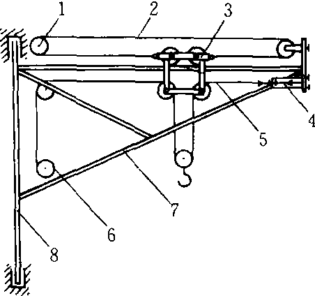 固定式悬臂起重机 1.摩擦卷筒 2. 运行绳 3. 起重小车 4. 导向滑轮 5. 起升绳 6. 起升卷筒 7. 臂架 8. 转柱 |
