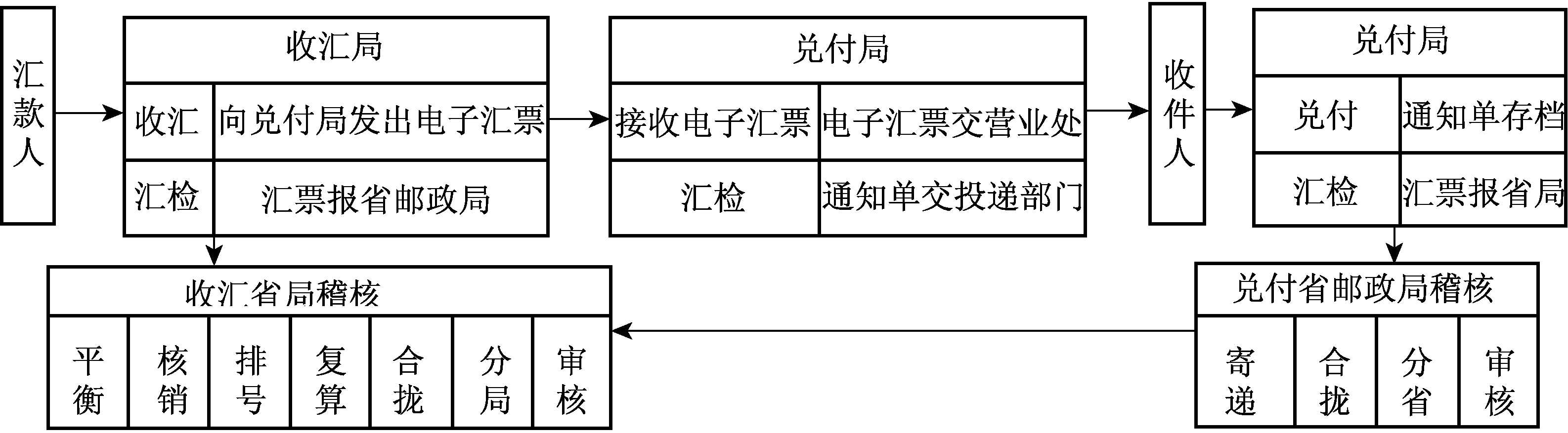 | 释义 | 国内邮政汇兑过程domestic postal remittance process邮局受汇款人委托,从收进汇款到将汇款如数兑付给指定收款人的全部处理过程。中国从2002年开始,邮政汇款从采用汇套按邮件传递汇款凭证的方式改为采用电子汇款的方式。其处理过程见下图。目前邮政汇兑的处理过程,包括汇兑稽核,已全部由人工操作改为计算机处理。