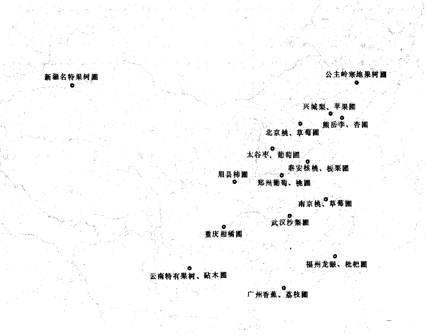 中国国家果树种质资源圃分布图 20世纪50年代, 中国开展了果树种质资源普查工作,在此基础上各地都收集和保存了一部分地方品种,及在育种上有利用价值的原始材料。中国农业科学院果树研究所、柑橘研究所、郑州果树研究所建所后, 以及各省(自治区)、市果树科研单位、根据科研工作的需要, 先后设置了保存范围和规模不等的品种园, 当时也称为果树原始材料圃。1979年中国农业科学院主持召开1981~1985年果树科技规划会议, 由中国农业科学院果树研究所根据50年代国家提出建立国家果树原始材料圃的长远规划, 制定提出国家果树种质圃的规划布局方案。得到农业部的批准。从1979年开始,以农业部与地方(省、自治区、市)投资合办的方式, 加上中国农业科学院直属的3个果树研究机构、共着手筹建15个国家果树种质资源圃(见图)。1987年开始起用《国家果树种质资源圃》名称, 1989年全部通过国家验收 (见表)。截至1989年末, 共计收集、保存苹果、梨、柑橘、葡萄、桃、李、杏、柿、枣、栗、核桃、龙眼、枇杷、香蕉、荔枝、草莓16个主要树种,和云南特有果树砧木资源、新疆名特果树、以及寒地果树, 涉及31个科58个属的果树种质资源8 900余份,圃地面积共120多公顷(其中保存圃约107公顷,引种观察圃约14公顷)。拥有实验室(包括温室、网室)约5 700平方米;从事果树种质资源研究的科技人员110余人。 建圃的同时,还对收集到的种质资源进行了登记、鉴别和分类整理。开展了系统观察和评价研究, 提出了较为完整的研究内容和程序;积累了丰富的标本、图片、影像、文字记载等档案资料, 其中柑橘、苹果、梨、桃、葡萄等树种的数据资料已输入电子计算机。国家果树种质资源圃建成后, 还向果树生产和科研部门多次提供良种良砧、种质材料, 在生产、科研、教学和国际交流中开始发挥作用。 中国国家果树种质资源圃保存树种的范围和数量已具有一定规模, 在鉴定、评价和保存方式的研究等方面, 正逐步深入开展工作。国外国家果树种质资源圃见种质库)。 中国国家果树种质资源圃简况(1989)