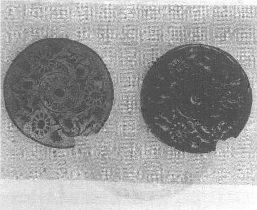 金。直径12.3厘米。1975年吉林省前郭他虎古城出土。吉林省文物考古研究所藏。镜圆形,背面中央有圆形钮,钮外依逆时针排列一周铭文:“盘沟左字王家造。”镜的内区、外区饰三朵串连枝叶的菊花,三童子攀枝嬉戏其间,纹饰十分生动活泼。镜边缘窄平。