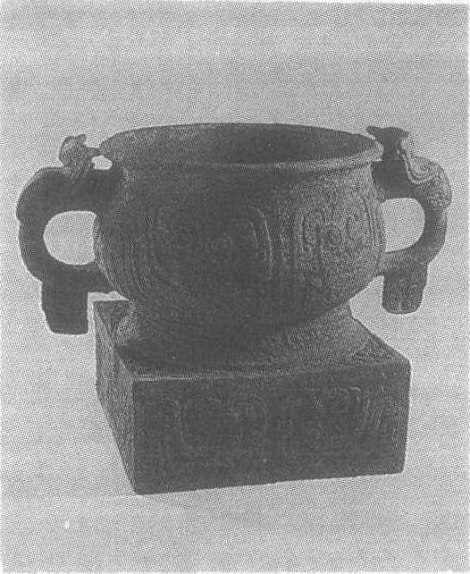 | 释义 | “盂”铜簋西周。盛食器,礼器。通高24.5厘米,口径23.4厘米。1961年陕西省长安县张家坡出土。陕西省博物馆藏。此簋侈口,鼓腹,兽首双耳,下有垂珥,底具方座。腹部和方座均饰垂冠分尾对鸟纹。器底铸有铭文五行四十二字,追述盂的父亲是毛公遣仲的下属,因有军功受到赏赐。盂称其父为“文考”或“考”,表明其父已阵亡,故由盂代父受赐。盂特作此簋以兹纪念。此器是西周早期流行的方座簋,其造型简朴实用。