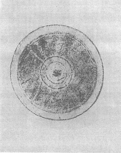战国。直径10厘米。重75克。河南省文物商店收购。此镜收购时残为四块,已修复。圆形,体质薄,镜面向内浅凹,有光泽。背面中央有拱桥形弦带钮,钮周围饰三圈凸起的细线弦纹,纹间铸有“祖甲”二字。镜边有一周凸线纹,其间饰粒状纹和凸起的细线菱形纹,边沿略向上卷,无镜铭。
