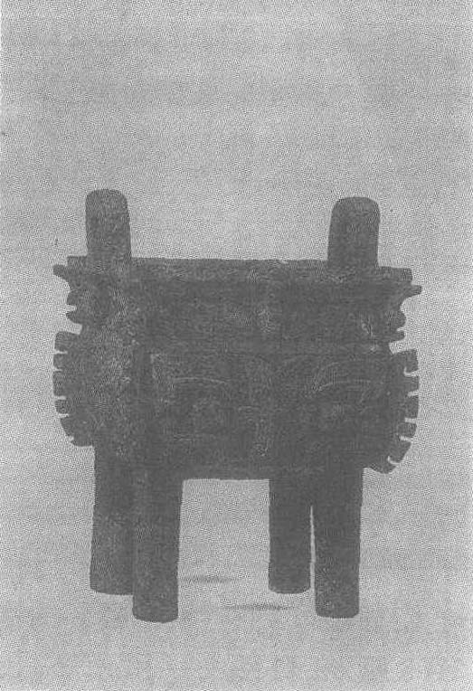 | 释义 | “禺”铜方鼎商。炊器,礼器。通高22.9厘米,口长16.6厘米。1957年山东省长清兴复河出土。山东省博物馆藏。此鼎双立耳,方唇,腹部膨出,四柱足。口沿下内收成颈,有一圈夔纹带,间有短扉棱。腹部饰饕餮纹,四隅起有扉棱。足饰垂叶纹。器内壁铸有铭文“𤕰,祖辛,禺,亚”七字。此器同时出土一对,造型奇异,器身上的扉棱断续突出,也较为特殊。