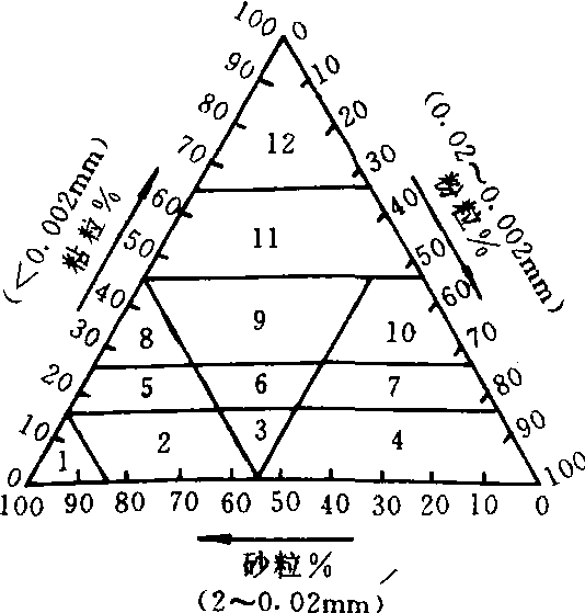 国际制土壤质地分类三角图 土壤质地名称:1.砂土及壤质砂土 2. 砂质壤土 3. 壤土 4. 粉砂质砂土 5.砂质黏壤土 6. 黏壤土 7. 粉砂质黏壤土 8.砂质黏土 9. 壤质黏土 10. 粉砂质黏土 11. 黏土 12. 重黏土 国际制土壤质地分类表