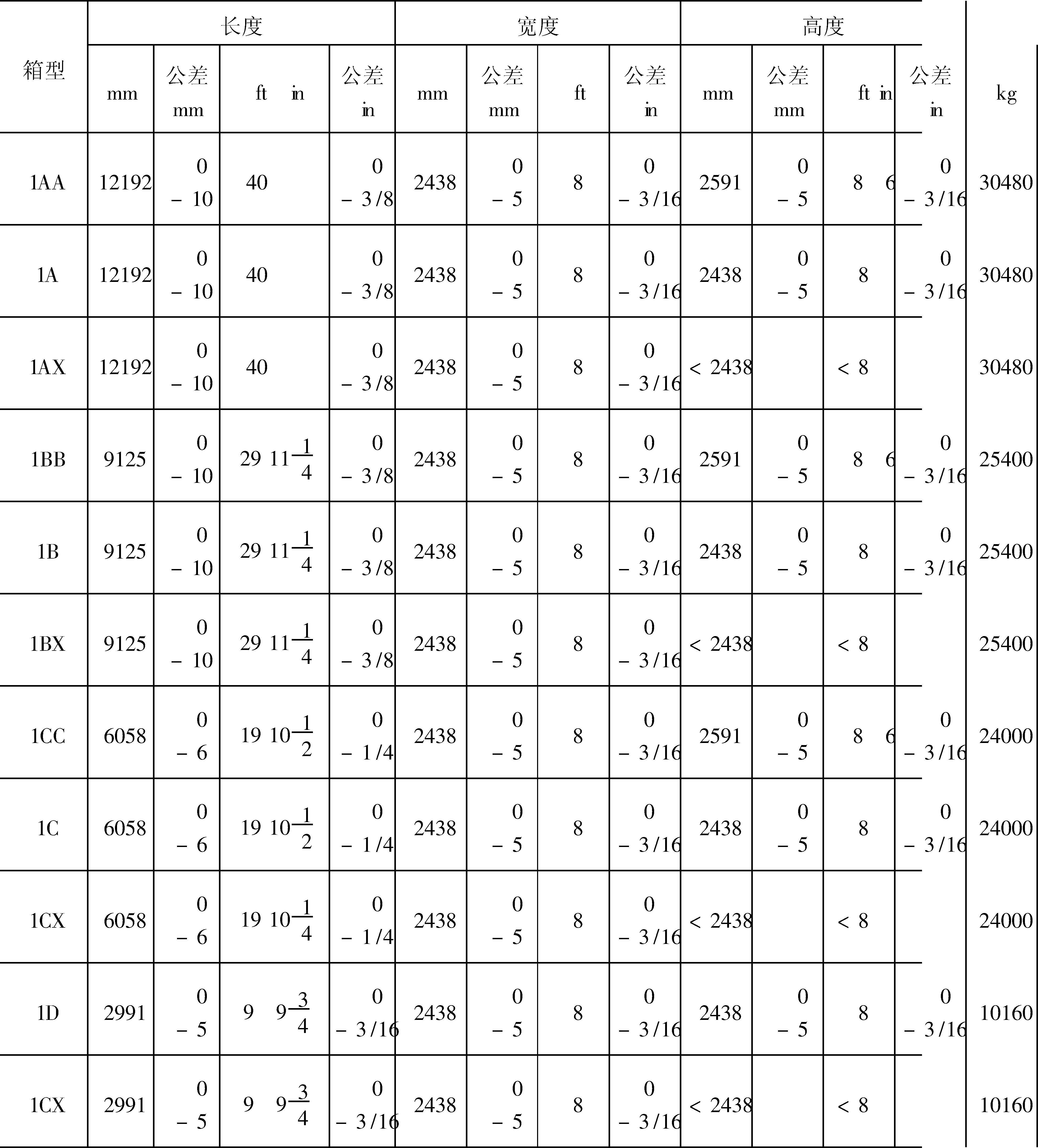 国际标准集装箱国际集装箱标准技术委员会制定的集装箱标准。1961年6月,ISO/TC104集装箱技术委员会成立,开始着手制订国际集装箱标准。第1个国际集装箱标准系列,1964年在汉堡召开的第3次大会上提出,分2个系列、9种箱型。1967年6月,在莫斯科召开的第5次大会上,增加第3系列3种箱型。1969年10月在莫利斯召开第6次会议,在第3系列中增加1AA箱型。1974年在东京召开的第8次会议,又增加1BB和1CC两种箱型,同时将第2系列降格为技术报告。1976年6月在华盛顿召开的第9次会议,第3系列也降格为技术报告。1993年6月,在哥本哈根召开的第17次会议上,增加AAA和1BBB两种新箱型。至今,国际标准集装箱系列分为11种。A型箱3种:1AA、1A、1AX,外部尺寸:长度均为12192mm,宽度均为2438mm,高度分别为2591mm、2438mm、小于2438mm。B型箱3种:1BB、1B、1BX,外部尺寸:长度均为9125mm,宽度均为2438mm,高度分别为2591mm、2438mm、小于2438mm。C型箱3种:1CC、1C、1CX,外部尺寸:长度均为6058mm,宽度均为2438mm,高度分别为2591mm、2438mm、小于2438mm。D型箱2种:1D、1DX,外部尺寸:长度均为2991mm,宽度均为2438mm,高度分别为2438mm、小于2438mm。A型总重30480kg、B型为25400kg、C型为2400kg、D型10160kg。各系列集装箱,外部尺寸之间的关系:1A=1B+1D+i(型号间距3in、76mm)=9125+2991+76=12192mm;1B=3D+2i=3×2991+2×76=8973+152=9125mm;1C=2D+i=2×2991+76=6058mm。集装箱的外部尺寸长宽高的乘积,即为集装箱的最大体积。内部尺寸长宽高的乘积为容积。箱最小内部高度=外部高度 -241mm,内部宽度为2230mm,箱门宽度2286mm。但各类箱最小内部长度和箱门高度(mm):1AAA为11998和2566,1AA为11998和2261,1A为11998和2134;1BBB为8931和2566,1BB为8931和2261,1B为8931和2134;1CC为5867和2261,1C为5867和2134,1D为2802和2134。除上述国际标准集装箱外,另有地区标准集装箱、国家标准集装箱、公司标准集装箱。 |