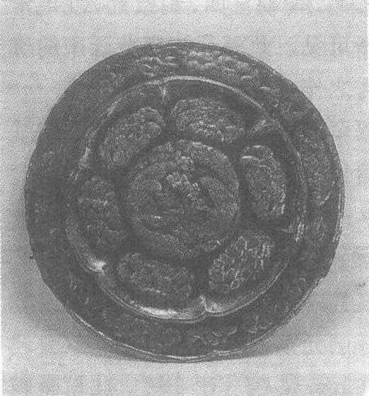 | 释义 | “裴肃进”刻花涂金鸾凤纹银盘唐。口径55厘米。1962年陕西省西安市北郊出土。陕西省博物馆藏。此盘作工精致,纹饰富丽。背面有铭文三行41字:“浙东道都团练观察处署等使”,“大中大夫守越州刺史兼御史大夫上柱国赐紫金鱼袋臣裴肃进”,“点过讫”。这银盘是裴肃向唐德宗李适的进献物之一。