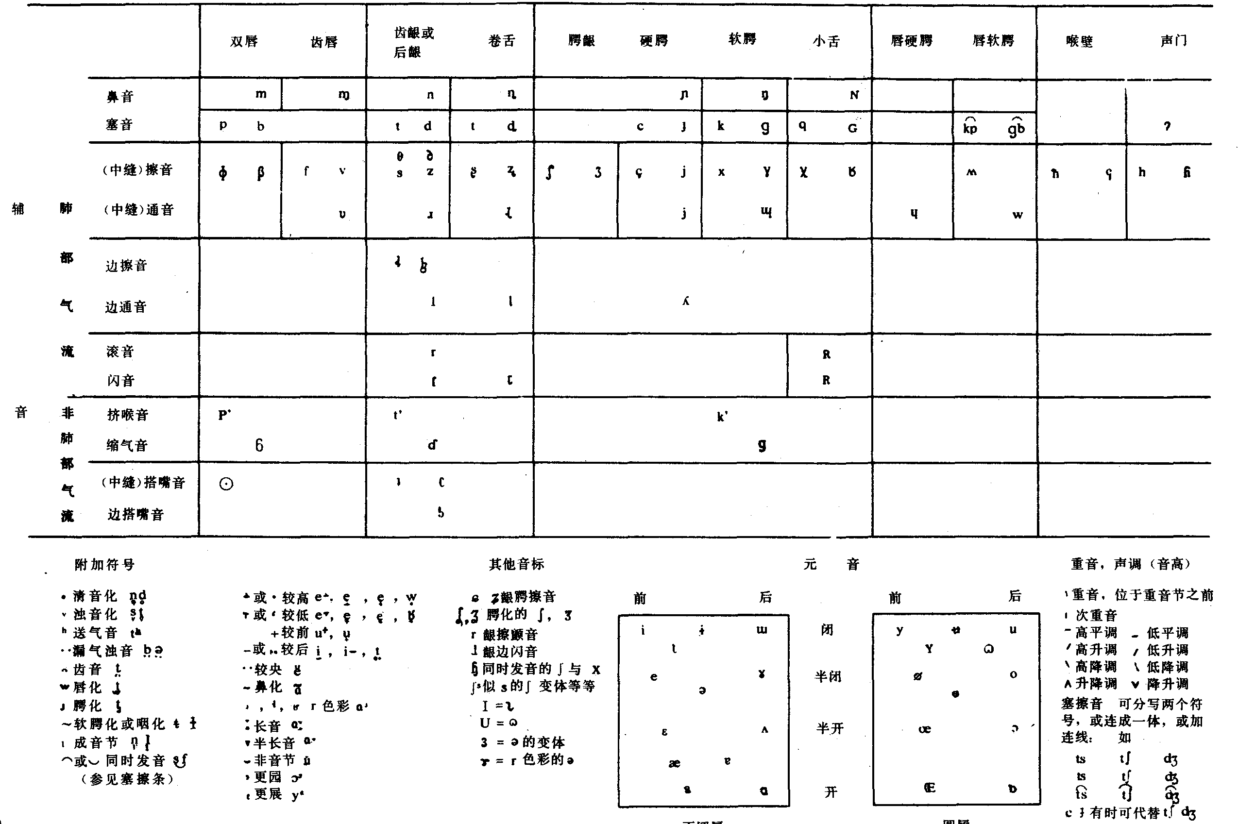 国际音标记录语音的一种符号体系。其初稿由国际语音学协会1888年制定,后几经修改,为各国所采用。多数符号为拉丁字母及其变形。中国常用于外语教学以及描写汉语、少数民族语和方言。通常用方括号表示,如[a]。 国际音标记录人类各种语言语音的符号体系。1888年由国际语音协会制定初稿,后经多次修改,为各国所采用。多数符号采用拉丁字母及其变形,少数采用别种字母和特别符号。现在通行的是1979年修订的方案,有辅音72个,元音23个。 |