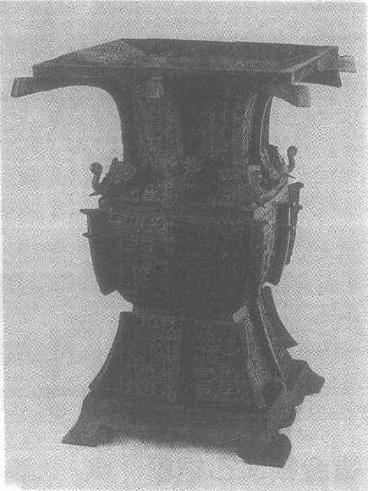 商。盛洒器,礼器。高45.7厘米,口径33.7厘米。台北故宫博物院藏。撇口,长颈,高方足。尊的四面各起三道扉棱,在肩部的四角还各浮雕一长鼻上卷的象首,两个象首中间夹一浮雕的鹿头。器遍饰凸起的夔龙纹和饕餮纹,古朴粗犷,立体感强。尊的口沿内刻铭文八字,分两行排列。
