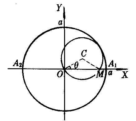 圆内旋轮线也叫内摆线. 一动圆沿一定圆内部滚动而无滑动时,圆外一点M(圆内一点N)的轨迹叫做长(短)幅圆内旋轮线. 长(短)幅圆内旋轮线的参数方程是