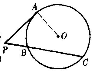 图3 割线定理 从圆外一点,引圆的两条割线,这点到每条割线与圆的交点的两条线段长的积相等.如图2,割线PB交圆于A,B,割线PD交圆于C,D,则PA·PB=PC·PD. 切割线定理 由圆外一点引圆的切线与割线,切线长是这点到割线与圆交点的两条线段长的比例中项.如图3,PA切圆于A,PC交圆于B,C,则PA2=PB·PC. |