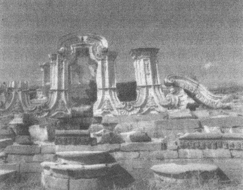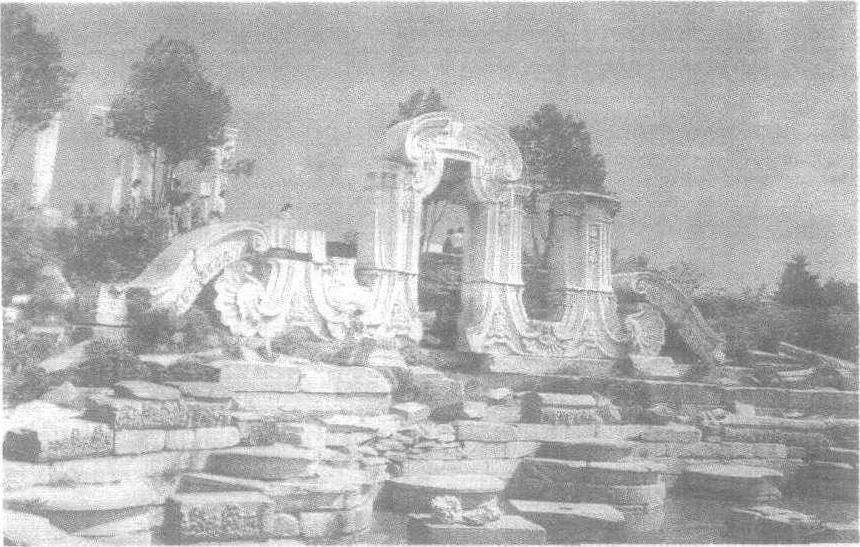圆明园大水法残迹 圆明园清代御苑。位于北京西郊挂甲屯之北,颐和园之东。明代皇室已在此建有林园。康熙四十八年(1709)在旧园基础上予以修整,赐与皇四子允祯(雍正帝),并亲题名为“圆明园”。雍正即位后,又增建殿堂楼阁,引水蓄池,广植林木,作为游览、听政之所。乾隆时曾六下江南,以江南多处名园蓝本,全面规划,大规模扩建,东面增修了长春园,东南合并了万春园 (即绮春园),初步形成了圆明三园 (习惯上统称为圆明园)。嘉庆、道光、咸丰又代代增修,经过六朝皇帝先后150年的营造,使圆明园益发辉煌,称为 “万园之园”。园占地约5200亩,有大门18座。圆明园在三园中面积最大,前后共48景,每一景中又可分若干小景,每一小景又是一组亭台楼阁的建筑群,其间山环水抱,花木掩映,步移景异,变幻万千。其布局可分三组,前湖前及两侧建筑区; 后湖以北建筑区; 福海四周建筑区。前面为朝廷区,另二部分为游览区。朝廷区正殿为“正大光明殿”,七楹,东殿额系雍正皇帝御笔。虽为正殿,但其庭院设计却很自然,不雕不绘,以达松轩茅舍之趣,皇帝所设各种宴事及殿前御试,常在此举行。其东配殿为皇帝批阅奏章的“勤政亲贤殿”,殿之东壁有御制 《创业守成难易说》,西壁有 《为君难跋》。正大光明殿后即为前湖,湖北有 “九洲清晏殿”,雍正帝和道光帝都死于此殿,殿东为“天地一家春”,西为 “乐安和”,是乾隆帝的寝殿。后湖为帝王嫔妃游玩的地区。有种植数百种牡丹及各种奇花异卉的镂月开云; 有皇帝诵文吟诗之处——碧桐书院; “万安安和”是建在水中的 “卐”字形房屋, 30多间, 造型美观, 建造精巧,还有冬暖夏凉之特点; “山高水长楼”为上下二层,每年元霄节在此观看烟火,其时殿前数千人挥舞各色宫灯,歌舞伴和,组成各种图案,变化无穷,而后烟火飞空,争奇夺艳。接待外藩也常在此举行。后湖北是各具特色的园中小园。“南北长街”是假设的一个交易场所,宫监扮成商人,仿市井买卖; “北远山村”是农村样式的区域,以突出自然风景之美; “水木明瑟”是利用水力推动风扇转动,以达室内清暑之功; 此外还有安佑宫、澹泊宁静、舍卫城、文源阁、廓然大公、四宜书屋等。福海在园之东部,又称东湖,水面辽阔,四周十岛环抱,中有“蓬莱三岛”。又建有方壶胜境、蓬岛瑶台、接秀山房、平湖秋月、曲院风荷、雷峰夕照、洛伽胜境、别有洞天、夹镜鸣琴、山容水态等,均造就成仙山琼阁状。咸丰十年(1860) 十月六日,英法联军攻入北京,占领圆明园,侵略军恣意抢掠园中豪华陈设和珍贵文物,后又放火焚烧,瑰丽的圆明三园成为废墟。