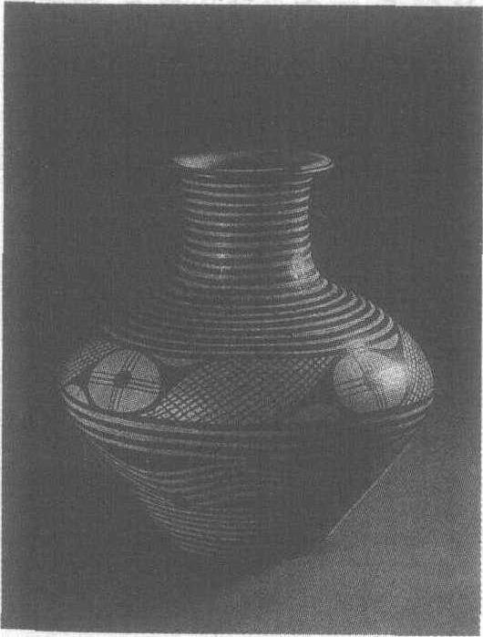 | 释义 | 圆点网纹彩陶瓶新石器时代马家窑文化马家窑类型。高28.5厘米,口径13厘米。1978年青海省民和县出土。口沿卷唇外撇,直颈,溜肩,腹中部以下内收。器身为橙黄色,表面打磨光滑极为细腻。通身用与橙黄产生强烈对比的墨彩饰纹。口沿为三撇叶纹。颈、肩以等粗的线条绘平行环带纹。肩部以下为主体纹饰。四组圈纹内饰三线十字纹。圈纹与菱纹构成的平行四边形相间的二方连续图案,此两种纹饰的空隙处成为弧线三角形。器腹下部除饰弦纹外,为避免呆板之嫌饰一圈加黑点的水波纹。此器花纹繁缛,笔触大胆泼辣,流畅有力,与器物浑然一体,表现了制陶人高超的艺术水平。马家窑文化见“束腰彩陶罐”条目。