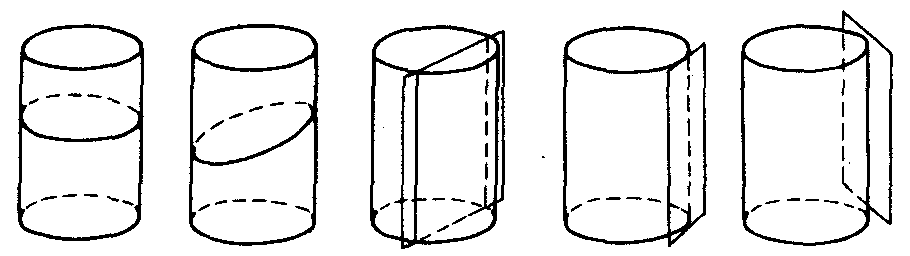 图1 当平面不通过锥顶,且和轴垂直时,所得截线是圆;当平面不通过锥顶,且和轴的夹角大于圆锥的半顶角而小于直角(或平面不平行任一母线)时,所得截线是椭圆;当平面不通过锥顶,且和轴的夹角等于半顶角(或平行于一条母线)时,所得截线是抛物线;当平面不通过锥顶,且和轴的夹角小于半顶角(或平行于两条母线)时,所得截线是双曲线(如图1). 当平面通过锥顶时,椭圆和圆变为一点,双曲线变为一对相交直线,抛物线变为与圆锥面相切的一条直线,这些都叫做退缩圆锥曲线,而圆、椭圆、双曲线、抛物线都叫做常态圆锥曲线. 用一个平面截割圆柱面,当平面和圆柱的轴垂直时,截线是圆;当平面和圆柱的轴斜交时,截线是椭圆;当平面和圆柱的轴平行或通过圆柱的轴时,截线可能是两条平行直线,可能是两条重合的直线——和圆柱侧面相切,也可能没有交线(如图2).