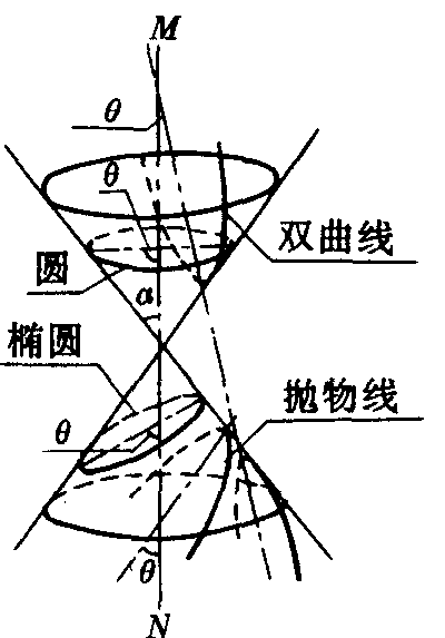 图2 圆锥曲线用一平面切割正圆锥时,得到的曲线。若平面P不通过锥顶,且不平行于任何母线,则截线为椭圆;若P不通过锥顶,而平行一条母线时,截线为抛物线;若P不通过锥顶,而平行于两条母线时,截线为双曲线;若P垂直于锥轴,截线为圆,可用二次方程表示。 |