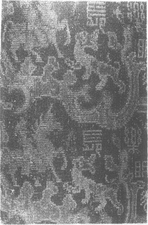 | 释义 | “长乐明光”锦东汉。残长49厘米,宽10厘米。1980年新疆维吾尔自治区罗布泊西岸楼兰故城东7公里高台墓地2号墓出土。新疆维吾尔自治区社会科学院考古研究所藏。此锦以宝蓝色作背景,用褐、绛、草绿三色作经线显花,纹样以卷云纹为骨干,穿插以各种动物,并缀以吉祥铭文。在浮动的云纹中,有一长翼的怪兽。一匹作奔跑状的马,上坐一人。一只回首吠叫的狗。在狗头上方织一隶书“长”字,“长”的右侧,隔着云纹织有隶书“乐明光”,与“长”字相互辉映。锦的经纬密度经线每平方厘米46根,纬线26根。“长乐明光”四字,寄寓吉祥之意。