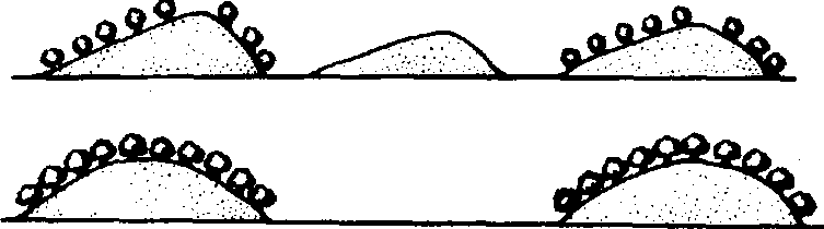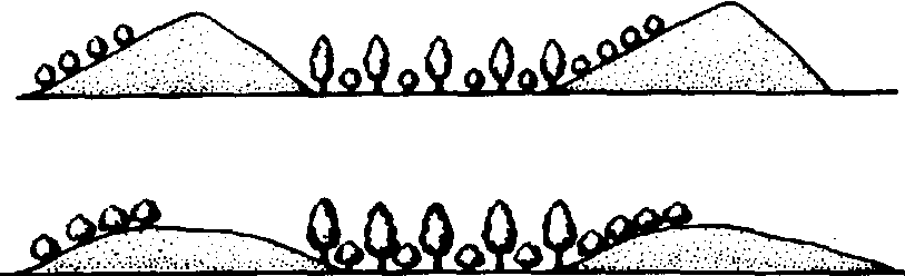 图3 倒对沙窝造林法示意 种草 在荒坡、荒沟、沙滩、流沙地以及弃耕地、休闲地上,大量播种草本植物。可以蓄水保墒,防止土壤侵蚀;改善土壤理化性质;增加土壤有机质,提高土壤肥力;草本植物大部分可作饲料、肥料和燃料。技术要点:❶选择具有耐寒、耐旱、耐盐碱、耐瘠薄、抗逆性强的草种。适宜在黄土地区种植的草种有苜蓿、草木樨、黄花菜、毛叶苕子、野豌豆、箭舌豌豆、沙打旺等。适宜在湿润的土石山区种植的草种有龙须草、葛藤等。适宜在沙区种植的草种有沙竹、沙米、沙蒿、沙打旺、油沙草、芨芨草等。 ❷在春季、秋季或随雨情况播种。有撒播、点播、条播和飞机播种等四种。草木樨、苜蓿、毛叶苕子等草子在平坦地区均可采用撒播方法。在较陡的坡地上可采用点播方法。油沙草和沙打旺可用条播或垄播方法。在地势较平坦、面积较大地区可采用飞机播种,其优点是速度快,效率高,节省大量劳力,能深入到地广人稀,交通不便,群众力所不及的地方。 ❸草场管理,包括轮封轮牧、人工更新、封山育草和营造护草林带与修筑草场工程等。轮封轮牧可按天然地形划定季节牧场和放牧分区,然后按一定次序有计划地进行封育和放牧。人工更新,可一次完成或分带逐年完成。封山育草是迅速提高草场生产力的行之有效的方法。在风沙、积雪危害严重的草场,应按规划要求营造护草林带和修筑蓄水池、打井等工程措施。 |